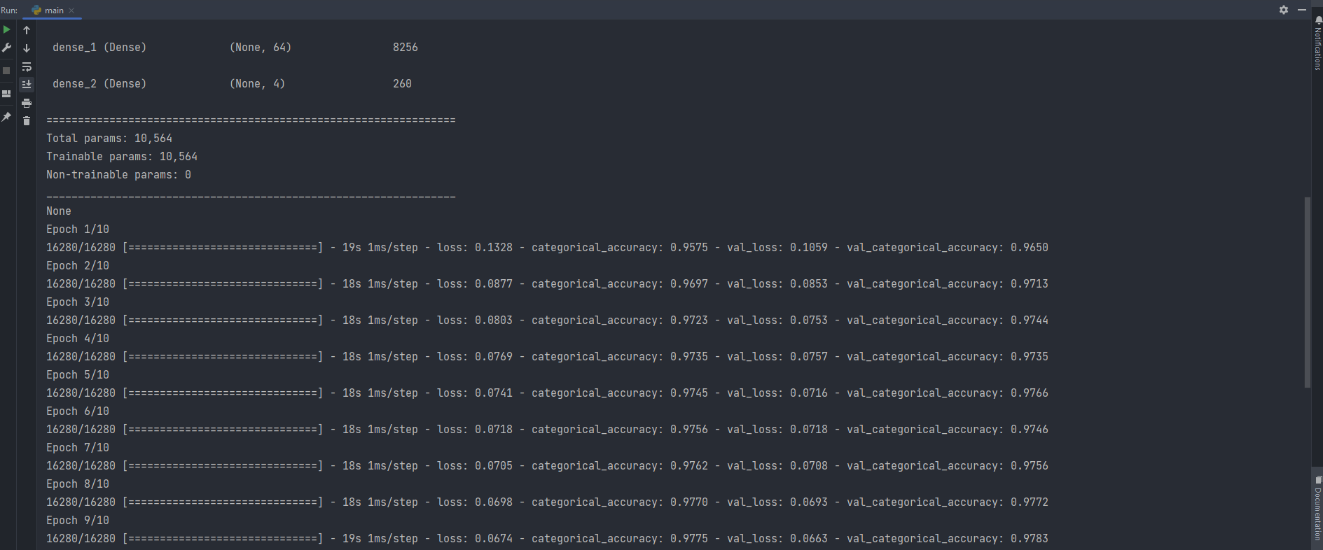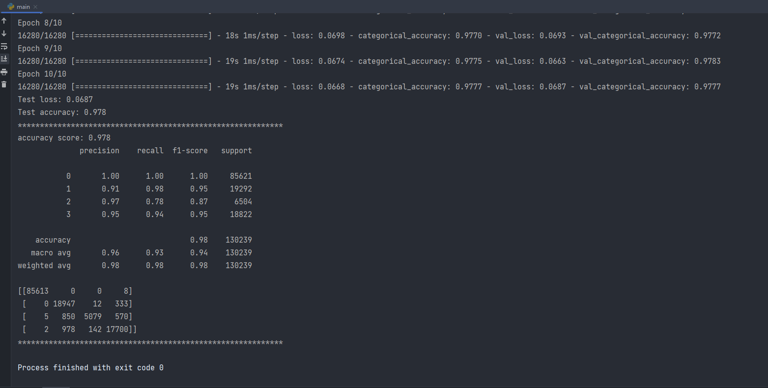 Because each sample contains 15 inputs and 4 outputs, the network requires an input layer in the first hidden layer that expects 15 inputs supplied by the “input dim” argument and four nodes in the output layer. In the hidden layer, we will employ the well-known relu activation function. The hidden layer contains 128 nodes that were selected by try and error. The second hidden layer contains 64 nodes. We’ll use categorical cross-entropy loss and the Adam version of stochastic gradient descent to fit the model. The last hidden layer is take 4 output which is our multi classess and softmax used which is used to multiclass problems.