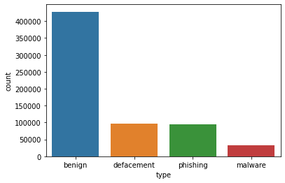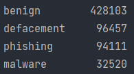 As shown number of type counts is 4 benign, defacement, phishing, and malware URLs
